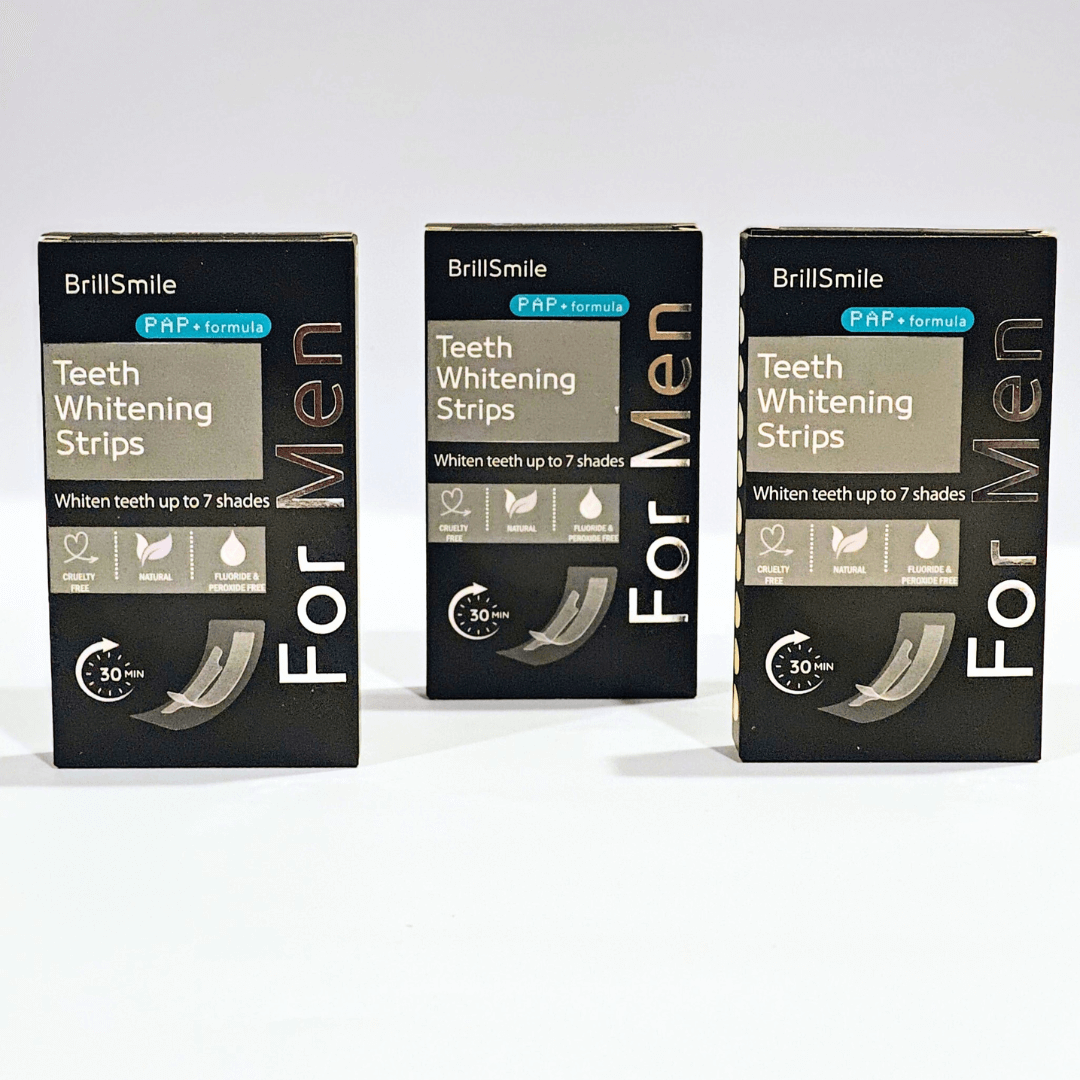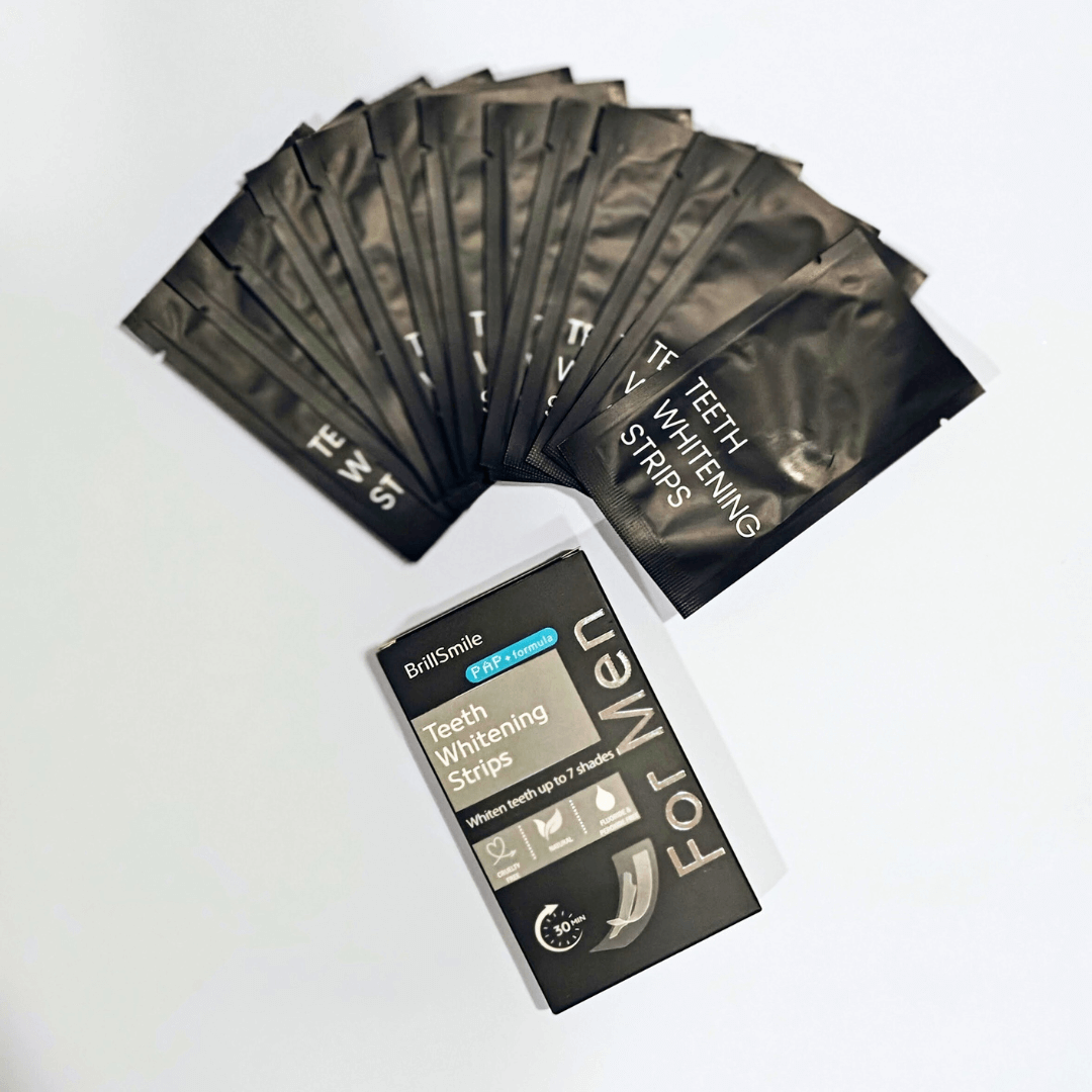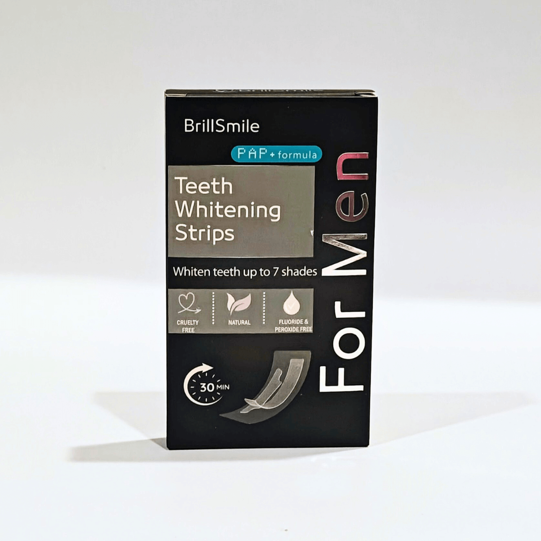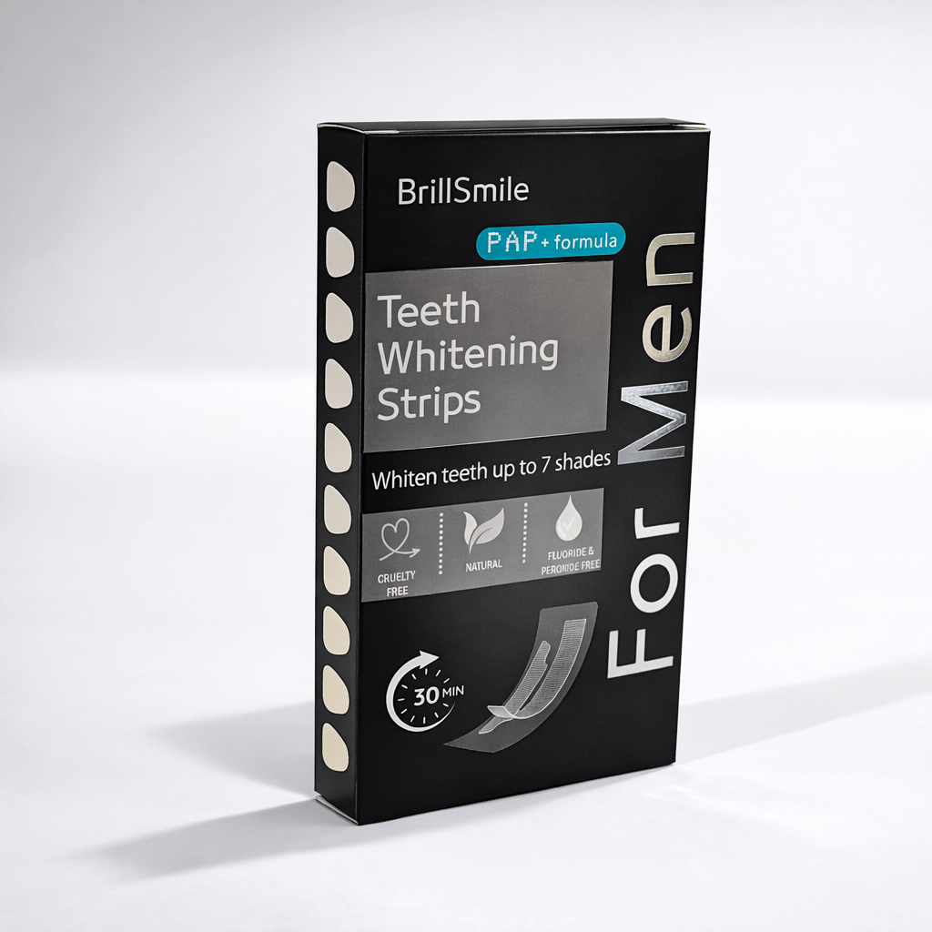 A BrillSmile For Men PAP+ Fogfehérítő Csíkok kifejezetten férfiak számára készültek, akik természetes, mégis látványos eredményt szeretnének. A fejlett PAP+ formula akár 7 árnyalattal világosítja a fogakat, miközben védi a zománcot és friss, mentolos érzetet biztosít. Fluorid- és peroxidmentes, így érzékeny fogak esetén is biztonságos választás.